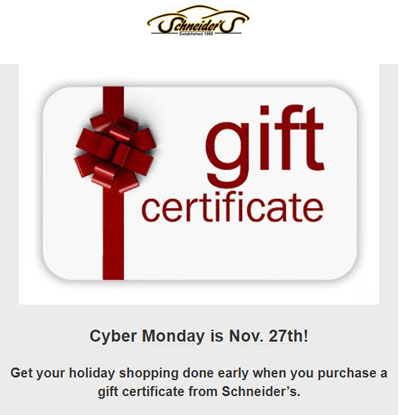 Get your holiday shopping done early when you purchase a gift certificate from Schneider’s!
